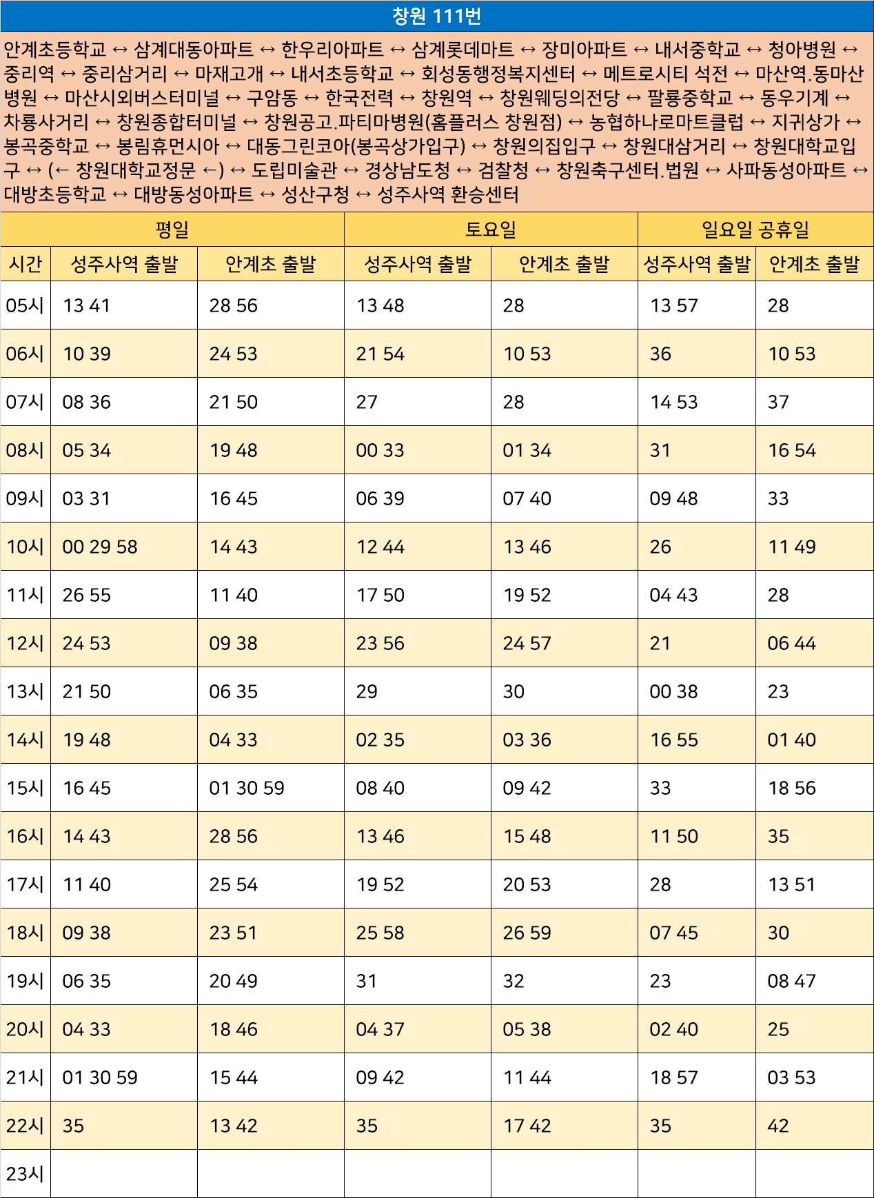 창원 111번: 안계초등학교 ↔ 삼계대동아파트 ↔ 한우리아파트 ↔ 삼계롯데마트 ↔ 장미아파트 ↔ 내서중학교 ↔ 청아병원 ↔ 중리역 ↔ 중리삼거리 ↔ 마재고개 ↔ 내서초등학교 ↔ 회성동행정복지센터 ↔ 메트로시티 석전 ↔ 마산역.동마산병원 ↔ 마산시외버스터미널 ↔ 구암동 ↔ 한국전력 ↔ 창원역 ↔ 창원웨딩의전당 ↔ 팔룡중학교 ↔ 동우기계 ↔ 차룡사거리 ↔ 창원종합터미널 ↔ 창원공고.파티마병원(홈플러스 창원점) ↔ 농협하나로마트클럽 ↔ 지귀상가 ↔ 봉곡중학교 ↔ 봉림휴먼시아 ↔ 대동그린코아(봉곡상가입구) ↔ 창원의집입구 ↔ 창원대삼거리 ↔ 창원대학교입구 ↔ (← 창원대학교정문 ←) ↔ 도립미술관 ↔ 경상남도청 ↔ 검찰청 ↔ 창원축구센터.법원 ↔ 사파동성아파트 ↔ 대방초등학교 ↔ 대방동성아파트 ↔ 성산구청 ↔ 성주사역 환승센터