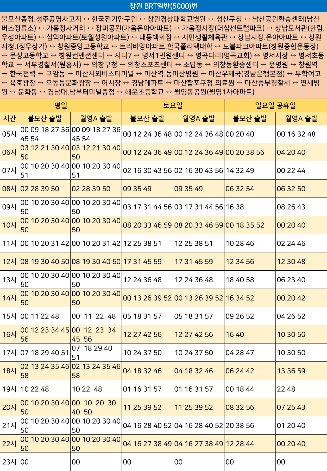 창원 BRT일반(5000)번: 불모산종점.성주공영차고지 ↔ 한국전기연구원 ↔ 창원경상대학교병원 ↔ 성산구청 ↔ 남산공원환승센터(남산버스정류소) ↔ 가음정사거리 ↔ 장미공원(가음은아아파트) ↔ 가음정시장(더샵센트럴파크) ↔ 상남도서관(한림.우성아파트) ↔ 삼익아파트(토월성원아파트) ↔ 대동백화점 ↔ 시민생활체육관 ↔ 상남시장.은아아파트 ↔ 창원시청.(정우상가) ↔ 창원중앙고등학교 ↔ 트리비앙아파트.한국폴리텍대학 ↔ 노블파크아파트(창원종합운동장) ↔ 문성고등학교 ↔ 창원컨벤션센터 ↔ 시티7 ↔ 명서1민원센터 ↔ 명곡다리(명곡교회) ↔ 명서시장 ↔ 명서초등학교 ↔ 서부경찰서(원흥사) ↔ 의창구청 ↔ 의창스포츠센터 ↔ 소답동 ↔ 의창동환승센터 ↔ 윤병원 ↔ 창원역 ↔ 한국전력 ↔ 구암동 ↔ 마산시외버스터미널 ↔ 마산역.동마산병원 ↔ 마산우체국(경남은행본점) ↔ 무학여고 ↔ 육호광장 ↔ 오동동문화광장 ↔ 어시장 ↔ 경남데파트 ↔ 마산합포구청.의료원 ↔ 마산중부경찰서 ↔ 연세병원 ↔ 문화동 ↔ 경남대.남부터미널종점 ↔ 해운초등학교 ↔ 월영동공원(월영1차아파트)