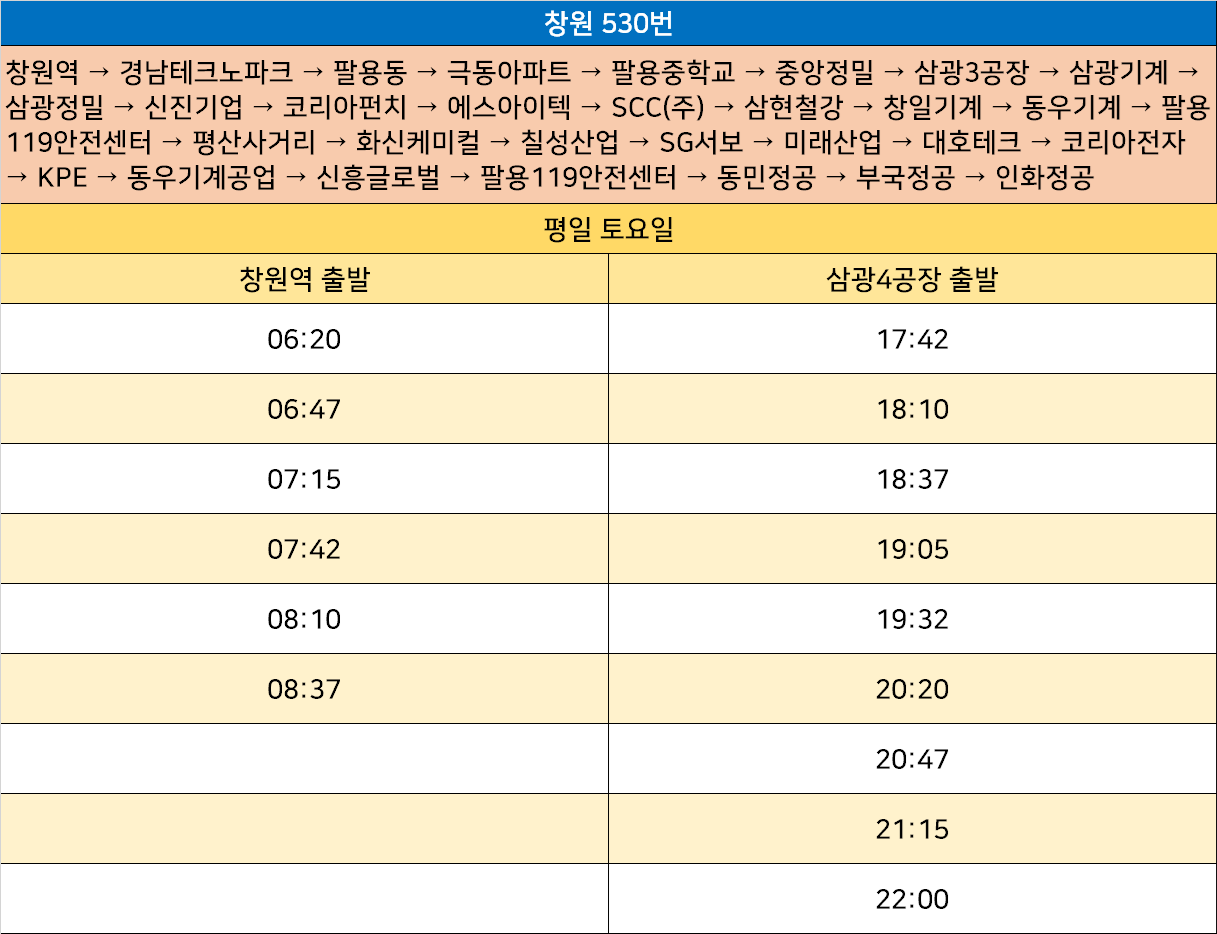 창원 530번: 창원역 → 경남테크노파크 → 팔용동 → 극동아파트 → 팔용중학교 → 중앙정밀 → 삼광3공장 → 삼광기계 → 삼광정밀 → 신진기업 → 코리아펀치 → 에스아이텍 → SCC(주) → 삼현철강 → 창일기계 → 동우기계 → 팔용119안전센터 → 평산사거리 → 화신케미컬 → 칠성산업 → SG서보 → 미래산업 → 대호테크 → 코리아전자 → KPE → 동우기계공업 → 신흥글로벌 → 팔용119안전센터 → 동민정공 → 부국정공 → 인화정공