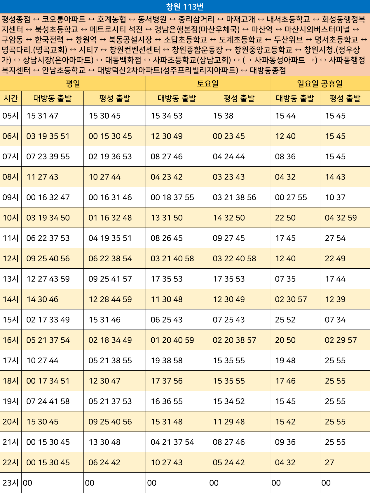 창원 113번: 평성종점 ↔ 코오롱아파트 ↔ 호계농협 ↔ 동서병원 ↔ 중리삼거리 ↔ 마재고개 ↔ 내서초등학교 ↔ 회성동행정복지센터 ↔ 북성초등학교 ↔ 메트로시티 석전 ↔ 경남은행본점(마산우체국) ↔ 마산역 ↔ 마산시외버스터미널 ↔ 구암동 ↔ 한국전력 ↔ 창원역 ↔ 북동공설시장 ↔ 소답초등학교 ↔ 도계초등학교 ↔ 두산위브 ↔ 명서초등학교 ↔ 명곡다리.(명곡교회) ↔ 시티7 ↔ 창원컨벤션센터 ↔ 창원종합운동장 ↔ 창원중앙고등학교 ↔ 창원시청.(정우상가) ↔ 상남시장(은아아파트) ↔ 대동백화점 ↔ 사파초등학교(상남교회) ↔ (→ 사파동성아파트 →) ↔ 사파동행정복지센터 ↔ 안남초등학교 ↔ 대방덕산2차아파트(성주프리빌리지아파트) ↔ 대방동종점