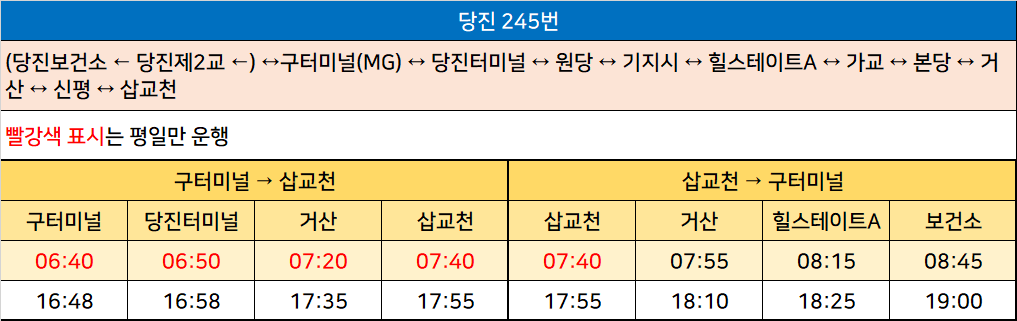 당진 245번: (당진보건소 ← 당진제2교 ←) ↔구터미널(MG) ↔ 당진터미널 ↔ 원당 ↔ 기지시 ↔ 힐스테이트A ↔ 가교 ↔ 본당 ↔ 거산 ↔ 신평 ↔ 삽교천