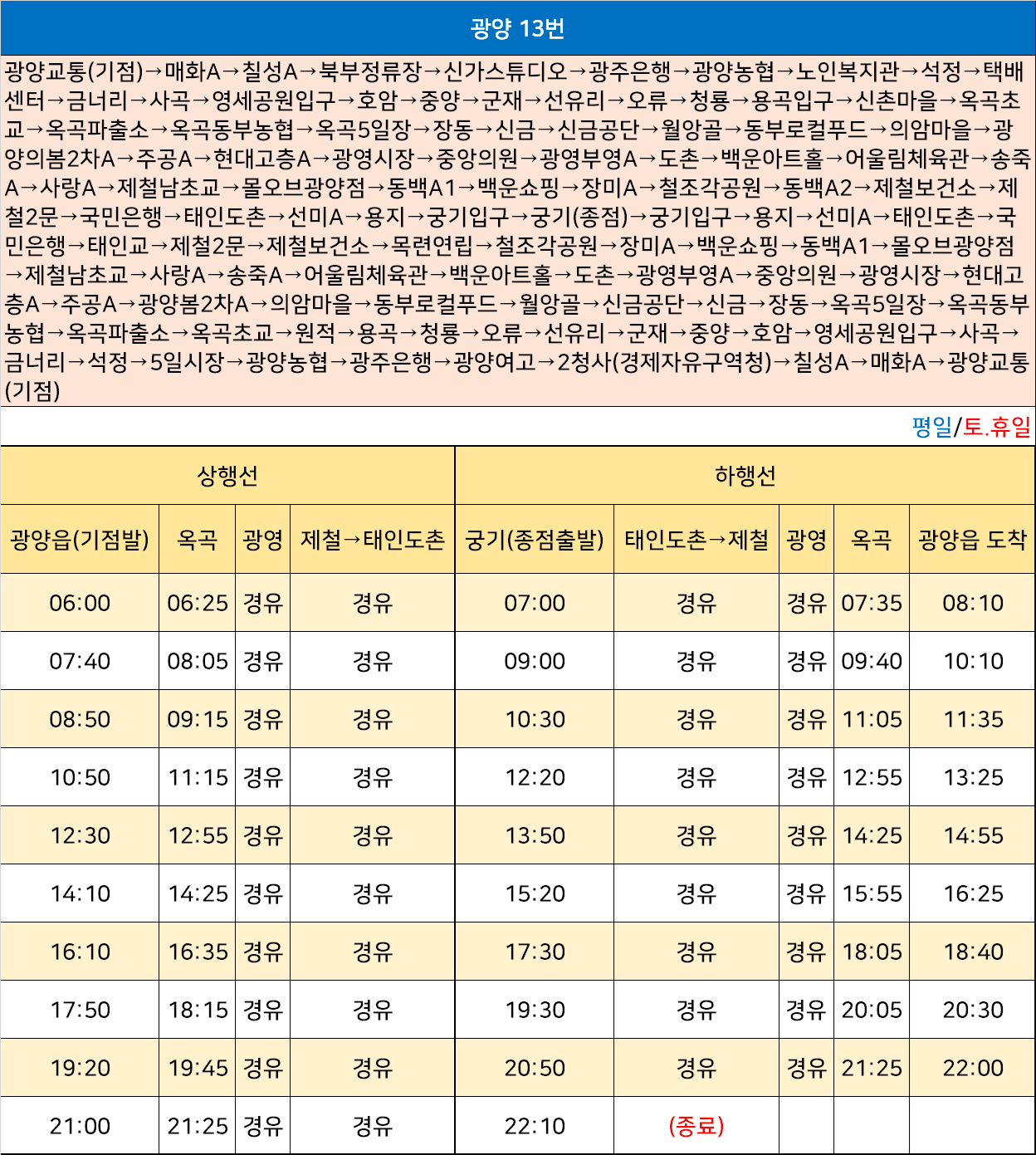 광양 13번: 광양교통(기점)→매화A→칠성A→북부정류장→신가스튜디오→광주은행→광양농협→노인복지관→석정→택배센터→금너리→사곡→영세공원입구→호암→중양→군재→선유리→오류→청룡→용곡입구→신촌마을→옥곡초교→옥곡파출소→옥곡동부농협→옥곡5일장→장동→신금→신금공단→월앙골→동부로컬푸드→의암마을→광양의봄2차A→주공A→현대고층A→광영시장→중앙의원→광영부영A→도촌→백운아트홀→어울림체육관→송죽A→사랑A→제철남초교→몰오브광양점→동백A1→백운쇼핑→장미A→철조각공원→동백A2→제철보건소→제철2문→국민은행→태인도촌→선미A→용지→궁기입구→궁기(종점)→궁기입구→용지→선미A→태인도촌→국민은행→태인교→제철2문→제철보건소→목련연립→철조각공원→장미A→백운쇼핑→동백A1→몰오브광양점→제철남초교→사랑A→송죽A→어울림체육관→백운아트홀→도촌→광영부영A→중앙의원→광영시장→현대고층A→주공A→광양봄2차A→의암마을→동부로컬푸드→월앙골→신금공단→신금→장동→옥곡5일장→옥곡동부농협→옥곡파출소→옥곡초교→원적→용곡→청룡→오류→선유리→군재→중양→호암→영세공원입구→사곡→금너리→석정→5일시장→광양농협→광주은행→광양여고→2청사(경제자유구역청)→칠성A→매화A→광양교통(기점)
