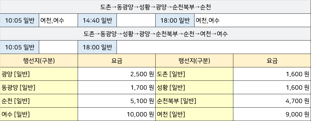 광영시외고속버스터미널 광영버스정류장 광영버스정류소 → "도촌→동광양→성황→광양→순천북부→순천→여천→여수".