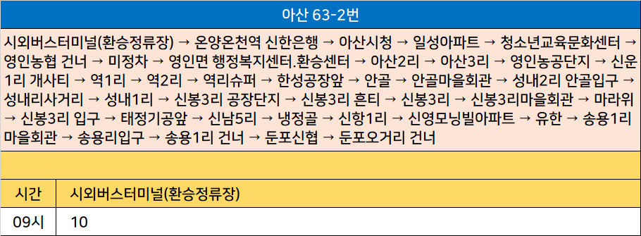 아산 63-2번: 시외버스터미널(환승정류장) → 온양온천역 신한은행 → 아산시청 → 일성아파트 → 청소년교육문화센터 → 영인농협 건너 → 영인면 행정복지센터.환승센터 → 아산2리 → 아산3리 → 영인농공단지 → 신운1리 개사티 → 역1리 → 역2리 → 역리슈퍼 → 한성공장앞 → 안골 → 안골마을회관 → 성내2리 안골입구 → 성내리사거리 → 성내1리 → 신봉3리 공장단지 → 신봉3리 흔티 → 신봉3리 → 신봉3리마을회관 → 마라위 → 신봉3리 입구 → 태정기공앞 → 신남5리 → 냉정골 → 신항1리 → 신영모닝빌아파트 → 유한 → 송용1리 마을회관 → 송용리입구 → 송용1리 건너 → 둔포신협 → 둔포오거리 건너