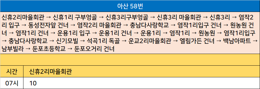 아산 58번: 신휴2리마을회관 → 신휴1리 구부엉골 → 신휴3리구부엉골 → 신휴3리 마을회관 → 신휴3리 → 염작2리 입구 → 동성전자앞 건너 → 염작2리 마을회관 → 충남다사랑학교 → 염작1리입구 건너 → 원농원 건너 → 염작1리 건너 → 운용1리 입구 → 운용1리 건너 → 운용1리 → 염작1리 → 원농원 → 염작1리입구 → 충남다사랑학교 → 신기모빌 → 석곡1리 독골 → 운교2리마을회관 → 엘림가든 건너 → 백남아파트 → 남부빌라 → 둔포초등학교 → 둔포오거리 건너