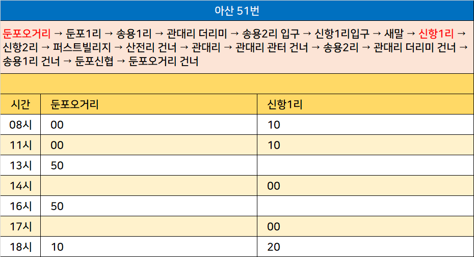 아산 51번: 둔포오거리 → 둔포1리 → 송용1리 → 관대리 더리미 → 송용2리 입구 → 신항1리입구 → 새말 → 신항1리 → 신항2리 → 퍼스트빌리지 → 산전리 건너 → 관대리 → 관대리 관터 건너 → 송용2리 → 관대리 더리미 건너 → 송용1리 건너 → 둔포신협 → 둔포오거리 건너