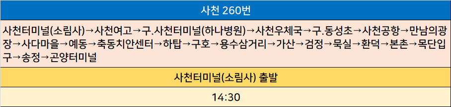 사천 260번: 사천터미널(소림사)→사천여고→구.사천터미널(하나병원)→사천우체국→구.동성초→사천공항→만남의광장→사다마을→예동→축동치안센터→하탑→구호→용수삼거리→가산→검정→묵실→환덕→본촌→목단입구→송정→곤양터미널