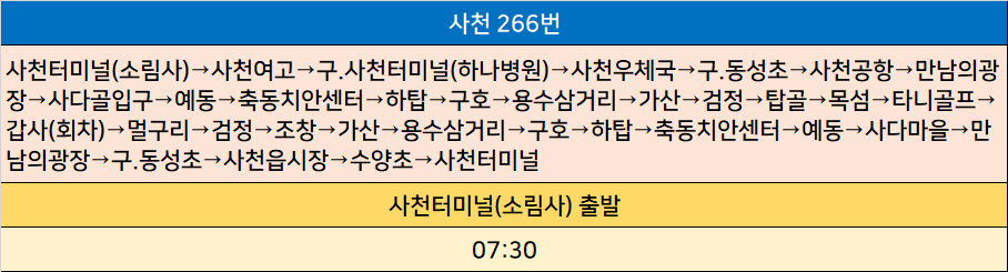 사천 266번: 사천터미널(소림사)→사천여고→구.사천터미널(하나병원)→사천우체국→구.동성초→사천공항→만남의광장→사다골입구→예동→축동치안센터→하탑→구호→용수삼거리→가산→검정→탑골→목섬→타니골프→갑사(회차)→멀구리→검정→조창→가산→용수삼거리→구호→하탑→축동치안센터→예동→사다마을→만남의광장→구.동성초→사천읍시장→수양초→사천터미널
