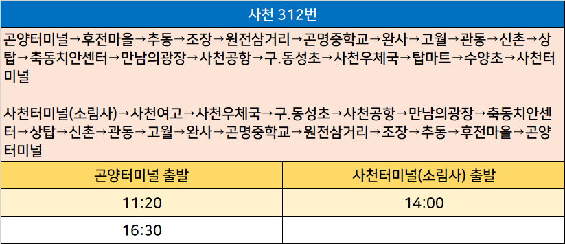 사천 312번: 곤양터미널→후전마을→추동→조장→원전삼거리→곤명중학교→완사→고월→관동→신촌→상탑→축동치안센터→만남의광장→사천공항→구.동성초→사천우체국→탑마트→수양초→사천터미널 / 사천터미널(소림사)→사천여고→사천우체국→구.동성초→사천공항→만남의광장→축동치안센터→상탑→신촌→관동→고월→완사→곤명중학교→원전삼거리→조장→추동→후전마을→곤양터미널
