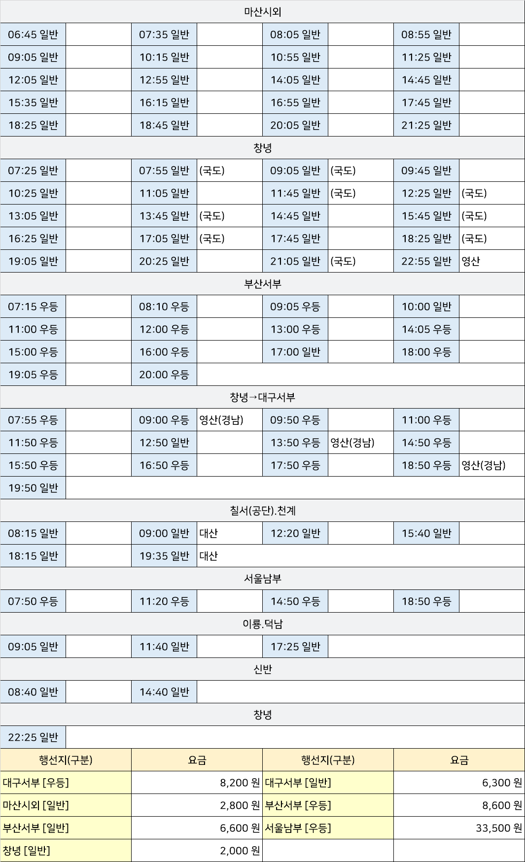 | 부곡시외고속버스터미널 시간표 [부곡정류소 부곡정류장 부곡면터미널 거문리터미널] (0) | 2025.04.13 |