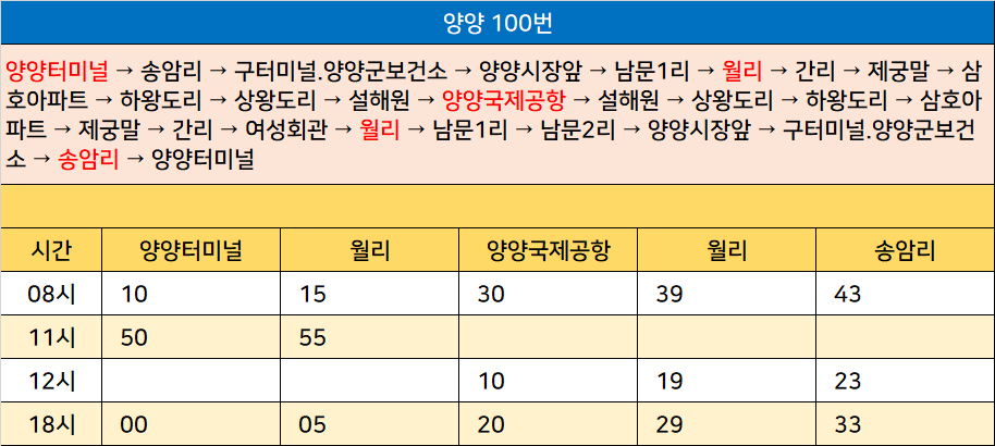 양양 100번: 양양터미널 → 송암리 → 구터미널.양양군보건소 → 양양시장앞 → 남문1리 → 월리 → 간리 → 제궁말 → 삼호아파트 → 하왕도리 → 상왕도리 → 설해원 → 양양국제공항 → 설해원 → 상왕도리 → 하왕도리 → 삼호아파트 → 제궁말 → 간리 → 여성회관 → 월리 → 남문1리 → 남문2리 → 양양시장앞 → 구터미널.양양군보건소 → 송암리 → 양양터미널