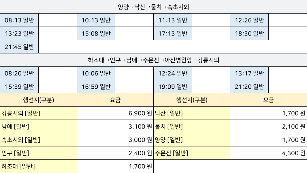 | 양양국제공항시외고속버스 터미널 시간표[양양국제공항정류소 양양국제공항정류장 손양면터미널 동호리터미널] (0) | 2025.05.13 |
