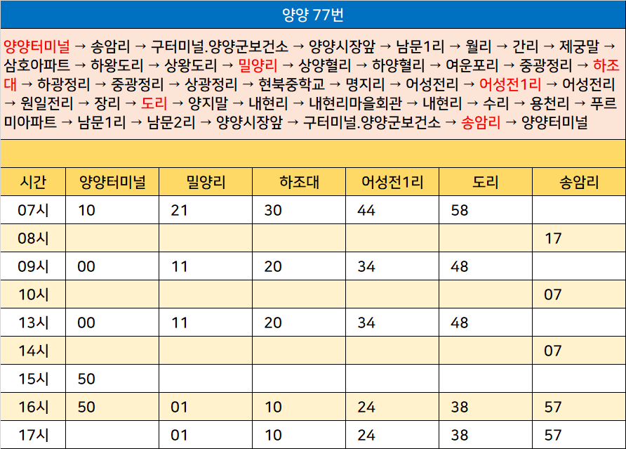 양양 77번: 양양터미널 → 송암리 → 구터미널.양양군보건소 → 양양시장앞 → 남문1리 → 월리 → 간리 → 제궁말 → 삼호아파트 → 하왕도리 → 상왕도리 → 밀양리 → 상양혈리 → 하양혈리 → 여운포리 → 중광정리 → 하조대 → 하광정리 → 중광정리 → 상광정리 → 현북중학교 → 명지리 → 어성전리 → 어성전1리 → 어성전리 → 원일전리 → 장리 → 도리 → 양지말 → 내현리 → 내현리마을회관 → 내현리 → 수리 → 용천리 → 푸르미아파트 → 남문1리 → 남문2리 → 양양시장앞 → 구터미널.양양군보건소 → 송암리 → 양양터미널