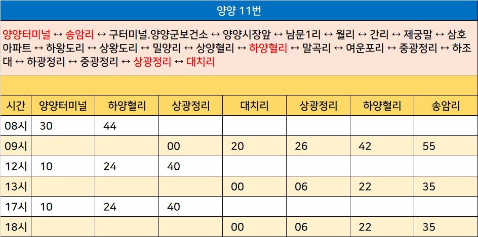 양양 11번: 양양터미널 ↔ 송암리 ↔ 구터미널.양양군보건소 ↔ 양양시장앞 ↔ 남문1리 ↔ 월리 ↔ 간리 ↔ 제궁말 ↔ 삼호아파트 ↔ 하왕도리 ↔ 상왕도리 ↔ 밀양리 ↔ 상양혈리 ↔ 하양혈리 ↔ 말곡리 ↔ 여운포리 ↔ 중광정리 ↔ 하조대 ↔ 하광정리 ↔ 중광정리 ↔ 상광정리 ↔ 대치리