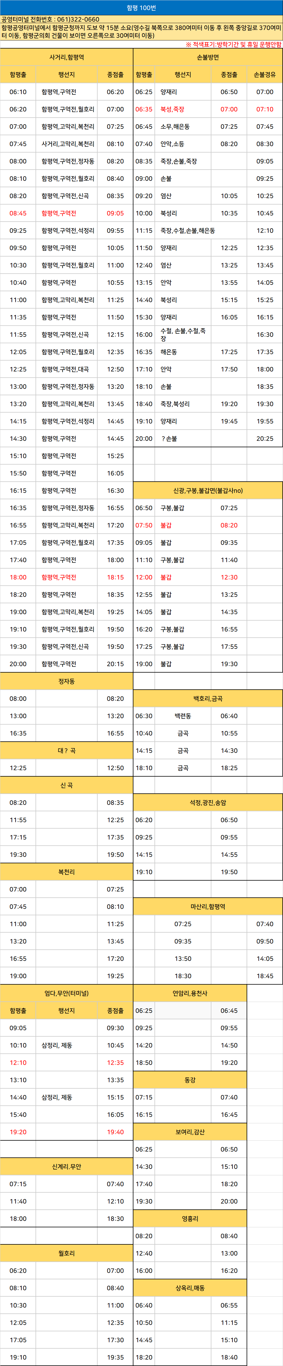 함평 100번: 감산, 고막리, 구봉, 구역전, 금곡, 대곡, 동강, 마산리, 무안, 백련동, 백호리, 보여리, 복천리, 북성, 북성리, 불갑면, 사거리, 삼정리, 석정리, 소등, 소무, 손불, 수철, 신계리, 신곡, 신광, 안악, 양재리, 엄다, 연암리, 염산, 영흥리, 용천사, 월호리, 정자동, 제동, 죽장, 함평역, 해은동