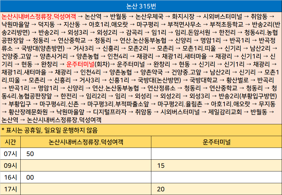 논산 315번: 논산시내버스정류장.덕성여객 → 논산역 → 반월동 → 논산우체국 → 화지시장 → 시외버스터미널 → 취암동 → 낙원마을앞 → 덕지동 → 지산동 → 아호1리.애오랏 → 마구평리 → 부적면사무소 → 부적초등학교 → 반송2리(반송2리방면) → 반송2리 → 외성3리 → 외성2리 → 감곡리 → 임1리 → 임리.돈암서원 → 한전리 → 청동4리.농협공판장앞 → 청동리 → 연산중학교 → 청동리 → 연산.논산동부농협 → 신양리 → 명암1리 → 반곡1리 → 반곡정류소 → 국방대(양촌방면) → 거사3리 → 신흥리 → 모촌2리 → 모촌리 → 모촌1리.띠울 → 신기리 → 남산2리 → 건양중.고앞 → 양촌사거리 → 양촌농협 → 인천4리 → 채광리 → 채광1리.새터마을 → 채광리 → 신기1리 → 신기리 → 현동 → 완창리 → 운주터미널(회차)→ 운주터미널 → 완창리 → 현동 → 신기리 → 신기1리 → 채광리 → 채광1리.새터마을 → 채광리 → 인천4리 → 양촌농협 → 양촌약국 → 건양중.고앞 → 남산2리 → 신기리 → 모촌1리.띠울 → 모촌리 → 신흥리 → 거사3리 → 신흥1리 → 국방대(논산방면) → 국방대학교 → 황산벌로 → 반곡리 → 반곡1리 → 명암1리 → 신양리 → 연산.논산동부농협 → 연산정류소 → 청동리 → 연산중학교 → 청동리 → 청동4리.농협공판장앞 → 한전리 → 임리2리 → 임리 → 외성리 → 외성2리 → 외성3리 → 반송2리(부황입구방면) → 부황입구 → 마구평4리.신촌 → 마구평3리.부적파출소앞 → 마구평2리.율림촌 → 아호1리.애오랏 → 무지동 → 황산장례문화원 → 낙원마을앞 → 디지털프라자 → 취암동 → 시외버스터미널 → 제일감리교회 → 반월동 → 논산역 → 논산시내버스정류장.덕성여객