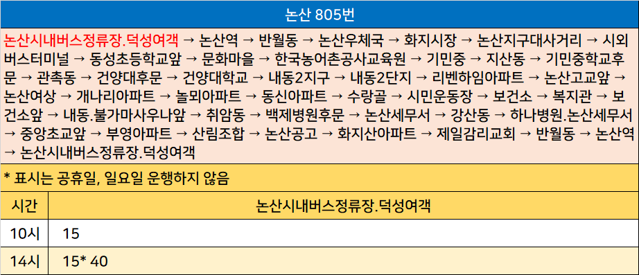 논산 805번: 논산시내버스정류장.덕성여객 → 논산역 → 반월동 → 논산우체국 → 화지시장 → 논산지구대사거리 → 시외버스터미널 → 동성초등학교앞 → 문화마을 → 한국농어촌공사교육원 → 기민중 → 지산동 → 기민중학교후문 → 관촉동 → 건양대후문 → 건양대학교 → 내동2지구 → 내동2단지 → 리벤하임아파트 → 논산고교앞 → 논산여상 → 개나리아파트 → 놀뫼아파트 → 동신아파트 → 수랑골 → 시민운동장 → 보건소 → 복지관 → 보건소앞 → 내동.불가마사우나앞 → 취암동 → 백제병원후문 → 논산세무서 → 강산동 → 하나병원.논산세무서 → 중앙초교앞 → 부영아파트 → 산림조합 → 논산공고 → 화지산아파트 → 제일감리교회 → 반월동 → 논산역 → 논산시내버스정류장.덕성여객