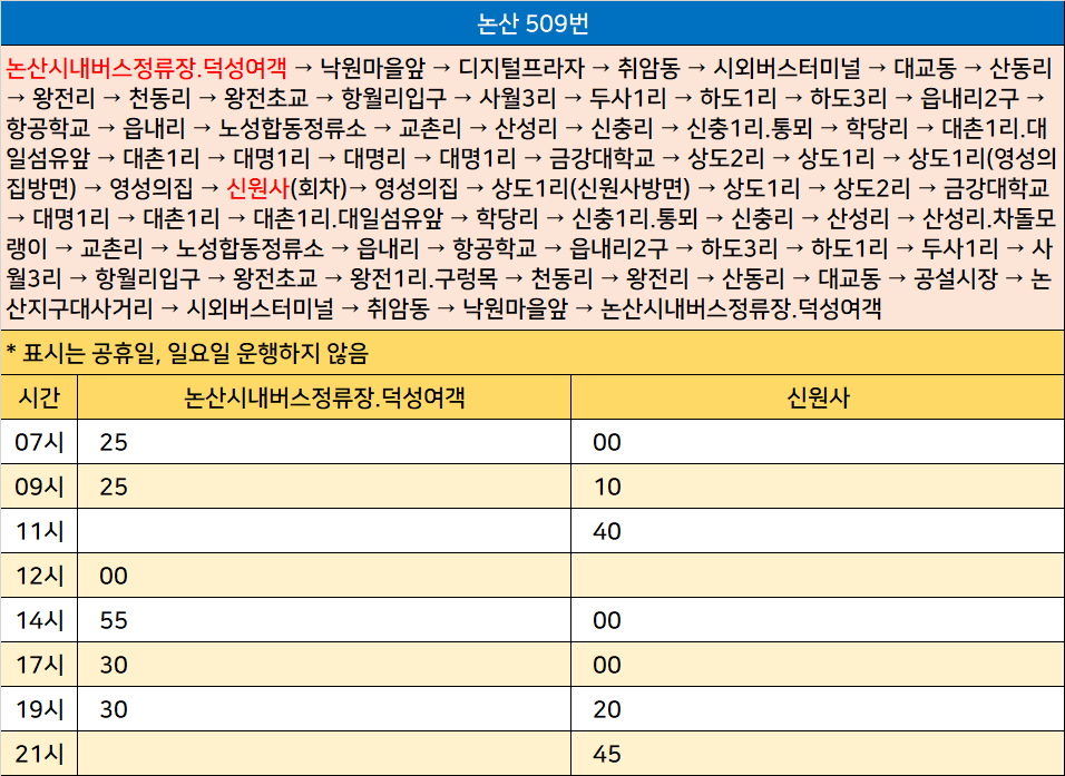 논산 509번: 논산시내버스정류장.덕성여객 → 낙원마을앞 → 디지털프라자 → 취암동 → 시외버스터미널 → 대교동 → 산동리 → 왕전리 → 천동리 → 왕전초교 → 항월리입구 → 사월3리 → 두사1리 → 하도1리 → 하도3리 → 읍내리2구 → 항공학교 → 읍내리 → 노성합동정류소 → 교촌리 → 산성리 → 신충리 → 신충1리.통뫼 → 학당리 → 대촌1리.대일섬유앞 → 대촌1리 → 대명1리 → 대명리 → 대명1리 → 금강대학교 → 상도2리 → 상도1리 → 상도1리(영성의집방면) → 영성의집 → 신원사(회차)→ 영성의집 → 상도1리(신원사방면) → 상도1리 → 상도2리 → 금강대학교 → 대명1리 → 대촌1리 → 대촌1리.대일섬유앞 → 학당리 → 신충1리.통뫼 → 신충리 → 산성리 → 산성리.차돌모랭이 → 교촌리 → 노성합동정류소 → 읍내리 → 항공학교 → 읍내리2구 → 하도3리 → 하도1리 → 두사1리 → 사월3리 → 항월리입구 → 왕전초교 → 왕전1리.구렁목 → 천동리 → 왕전리 → 산동리 → 대교동 → 공설시장 → 논산지구대사거리 → 시외버스터미널 → 취암동 → 낙원마을앞 → 논산시내버스정류장.덕성여객