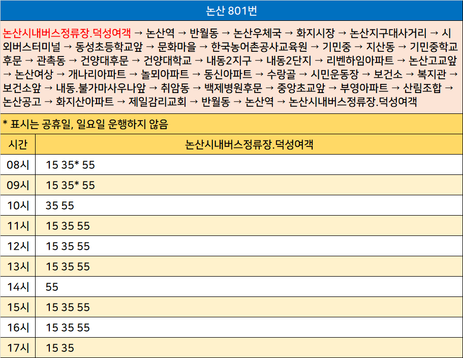 논산 801번: 논산시내버스정류장.덕성여객 → 논산역 → 반월동 → 논산우체국 → 화지시장 → 논산지구대사거리 → 시외버스터미널 → 동성초등학교앞 → 문화마을 → 한국농어촌공사교육원 → 기민중 → 지산동 → 기민중학교후문 → 관촉동 → 건양대후문 → 건양대학교 → 내동2지구 → 내동2단지 → 리벤하임아파트 → 논산고교앞 → 논산여상 → 개나리아파트 → 놀뫼아파트 → 동신아파트 → 수랑골 → 시민운동장 → 보건소 → 복지관 → 보건소앞 → 내동.불가마사우나앞 → 취암동 → 백제병원후문 → 중앙초교앞 → 부영아파트 → 산림조합 → 논산공고 → 화지산아파트 → 제일감리교회 → 반월동 → 논산역 → 논산시내버스정류장.덕성여객