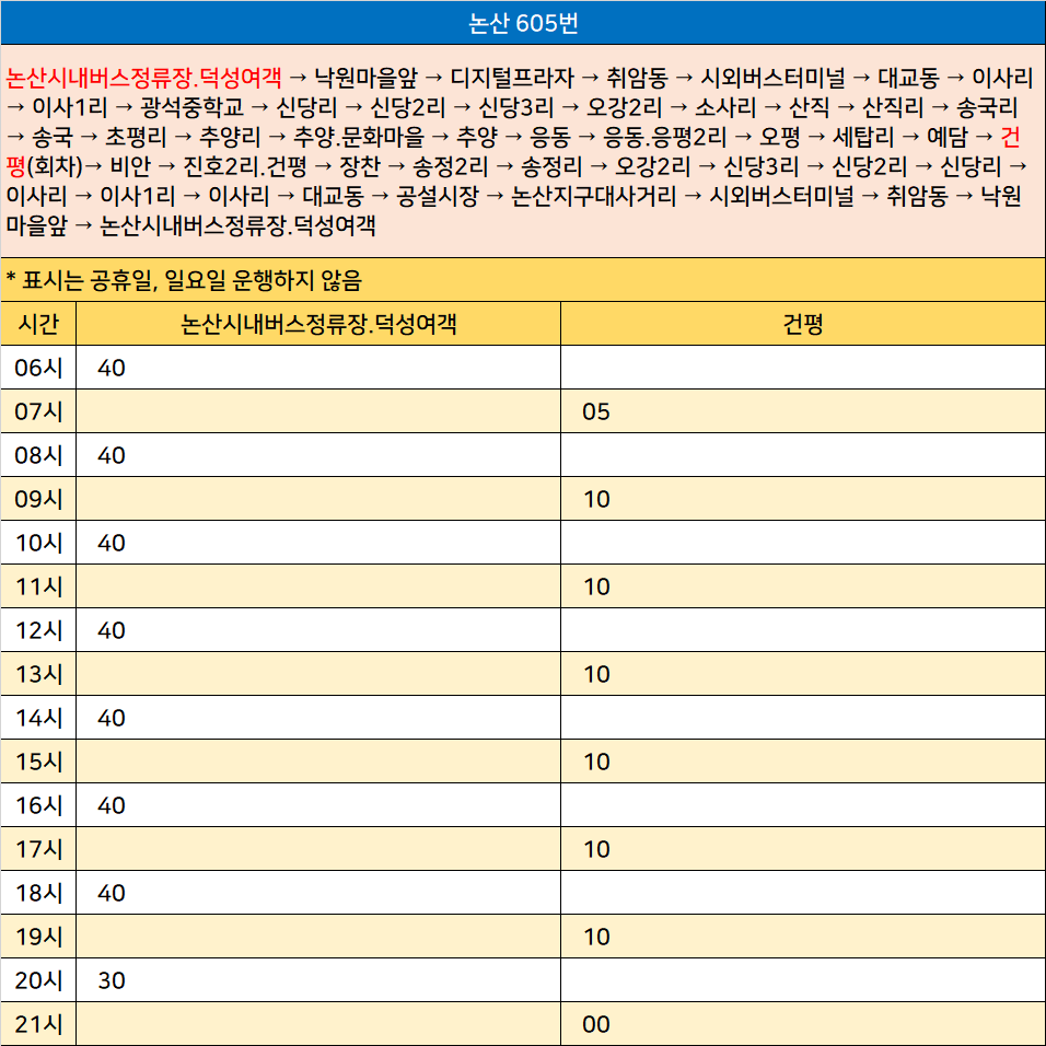 논산 605번: 논산시내버스정류장.덕성여객 → 낙원마을앞 → 디지털프라자 → 취암동 → 시외버스터미널 → 대교동 → 이사리 → 이사1리 → 광석중학교 → 신당리 → 신당2리 → 신당3리 → 오강2리 → 소사리 → 산직 → 산직리 → 송국리 → 송국 → 초평리 → 추양리 → 추양.문화마을 → 추양 → 응동 → 응동.응평2리 → 오평 → 세탑리 → 예담 → 건평(회차)→ 비안 → 진호2리.건평 → 장찬 → 송정2리 → 송정리 → 오강2리 → 신당3리 → 신당2리 → 신당리 → 이사리 → 이사1리 → 이사리 → 대교동 → 공설시장 → 논산지구대사거리 → 시외버스터미널 → 취암동 → 낙원마을앞 → 논산시내버스정류장.덕성여객