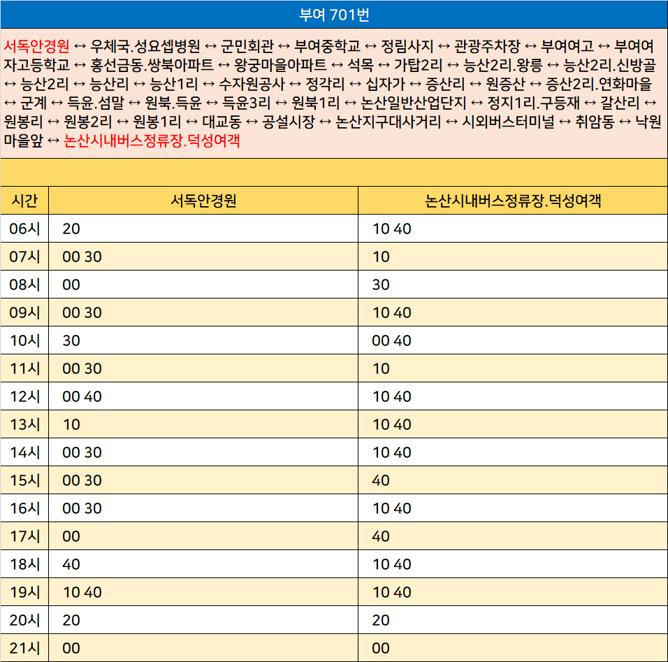 부여 701번: 서독안경원 ↔ 우체국.성요셉병원 ↔ 군민회관 ↔ 부여중학교 ↔ 정림사지 ↔ 관광주차장 ↔ 부여여고 ↔ 부여여자고등학교 ↔ 홍선금동.쌍북아파트 ↔ 왕궁마을아파트 ↔ 석목 ↔ 가탑2리 ↔ 능산2리.왕릉 ↔ 능산2리.신방골 ↔ 능산2리 ↔ 능산리 ↔ 능산1리 ↔ 수자원공사 ↔ 정각리 ↔ 십자가 ↔ 증산리 ↔ 원증산 ↔ 증산2리.연화마을 ↔ 군계 ↔ 득윤.섬말 ↔ 원북.득윤 ↔ 득윤3리 ↔ 원북1리 ↔ 논산일반산업단지 ↔ 정지1리.구등재 ↔ 갈산리 ↔ 원봉리 ↔ 원봉2리 ↔ 원봉1리 ↔ 대교동 ↔ 공설시장 ↔ 논산지구대사거리 ↔ 시외버스터미널 ↔ 취암동 ↔ 낙원마을앞 ↔ 논산시내버스정류장.덕성여객