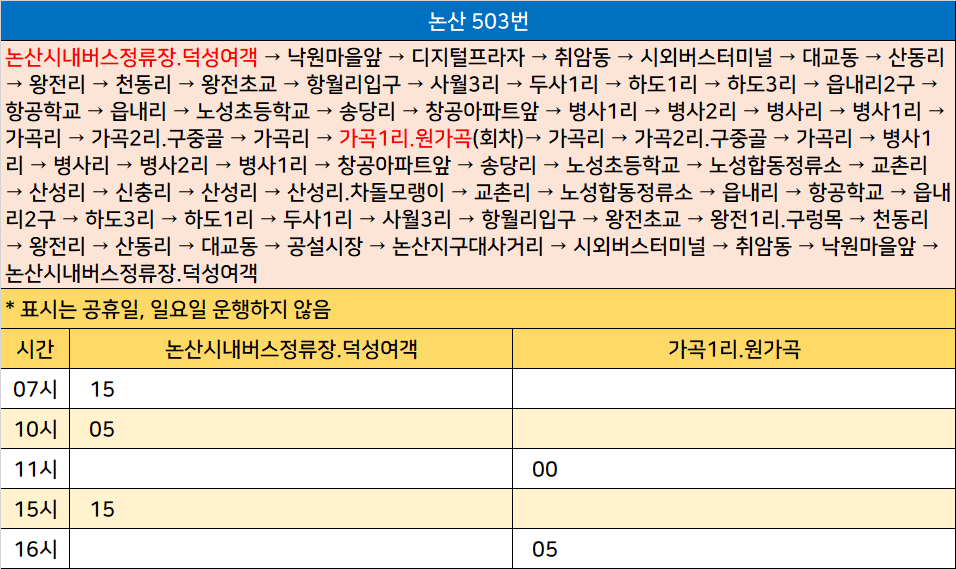논산 503번: 논산시내버스정류장.덕성여객 → 낙원마을앞 → 디지털프라자 → 취암동 → 시외버스터미널 → 대교동 → 산동리 → 왕전리 → 천동리 → 왕전초교 → 항월리입구 → 사월3리 → 두사1리 → 하도1리 → 하도3리 → 읍내리2구 → 항공학교 → 읍내리 → 노성초등학교 → 송당리 → 창공아파트앞 → 병사1리 → 병사2리 → 병사리 → 병사1리 → 가곡리 → 가곡2리.구중골 → 가곡리 → 가곡1리.원가곡(회차)→ 가곡리 → 가곡2리.구중골 → 가곡리 → 병사1리 → 병사리 → 병사2리 → 병사1리 → 창공아파트앞 → 송당리 → 노성초등학교 → 노성합동정류소 → 교촌리 → 산성리 → 신충리 → 산성리 → 산성리.차돌모랭이 → 교촌리 → 노성합동정류소 → 읍내리 → 항공학교 → 읍내리2구 → 하도3리 → 하도1리 → 두사1리 → 사월3리 → 항월리입구 → 왕전초교 → 왕전1리.구렁목 → 천동리 → 왕전리 → 산동리 → 대교동 → 공설시장 → 논산지구대사거리 → 시외버스터미널 → 취암동 → 낙원마을앞 → 논산시내버스정류장.덕성여객