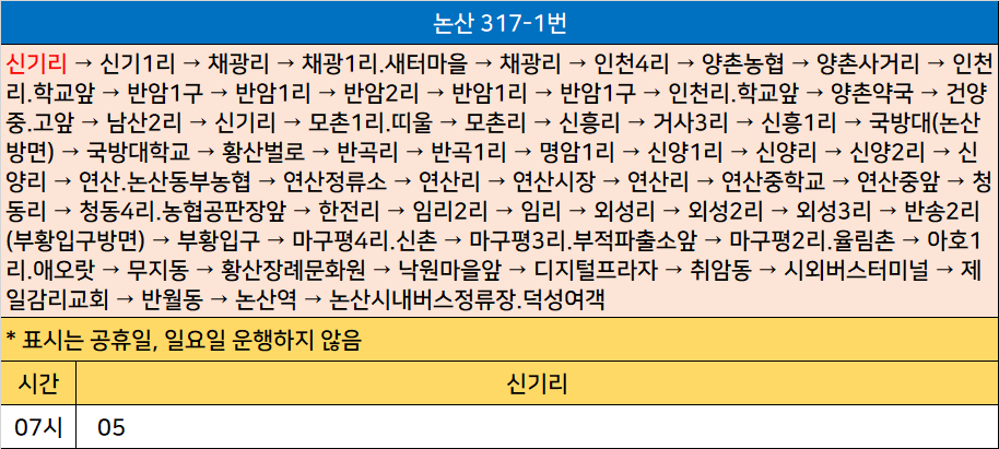 논산 317-1번: 신기리 → 신기1리 → 채광리 → 채광1리.새터마을 → 채광리 → 인천4리 → 양촌농협 → 양촌사거리 → 인천리.학교앞 → 반암1구 → 반암1리 → 반암2리 → 반암1리 → 반암1구 → 인천리.학교앞 → 양촌약국 → 건양중.고앞 → 남산2리 → 신기리 → 모촌1리.띠울 → 모촌리 → 신흥리 → 거사3리 → 신흥1리 → 국방대(논산방면) → 국방대학교 → 황산벌로 → 반곡리 → 반곡1리 → 명암1리 → 신양1리 → 신양리 → 신양2리 → 신양리 → 연산.논산동부농협 → 연산정류소 → 연산리 → 연산시장 → 연산리 → 연산중학교 → 연산중앞 → 청동리 → 청동4리.농협공판장앞 → 한전리 → 임리2리 → 임리 → 외성리 → 외성2리 → 외성3리 → 반송2리(부황입구방면) → 부황입구 → 마구평4리.신촌 → 마구평3리.부적파출소앞 → 마구평2리.율림촌 → 아호1리.애오랏 → 무지동 → 황산장례문화원 → 낙원마을앞 → 디지털프라자 → 취암동 → 시외버스터미널 → 제일감리교회 → 반월동 → 논산역 → 논산시내버스정류장.덕성여객