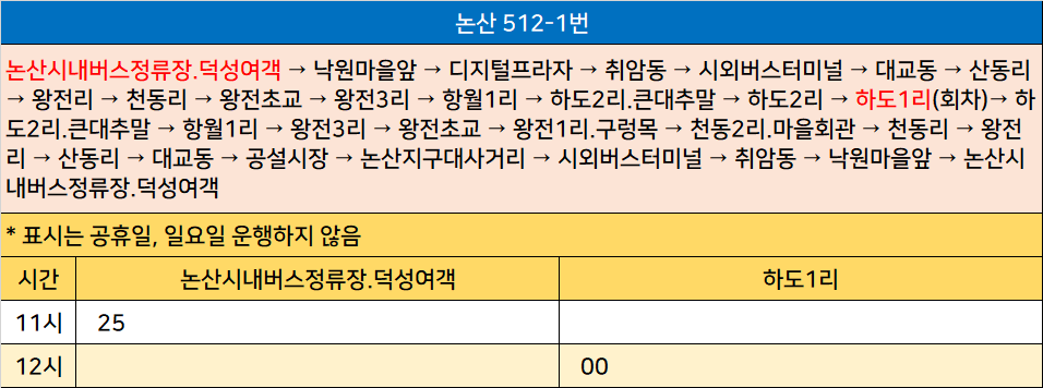 논산 512-1번: 논산시내버스정류장.덕성여객 → 낙원마을앞 → 디지털프라자 → 취암동 → 시외버스터미널 → 대교동 → 산동리 → 왕전리 → 천동리 → 왕전초교 → 왕전3리 → 항월1리 → 하도2리.큰대추말 → 하도2리 → 하도1리(회차)→ 하도2리.큰대추말 → 항월1리 → 왕전3리 → 왕전초교 → 왕전1리.구렁목 → 천동2리.마을회관 → 천동리 → 왕전리 → 산동리 → 대교동 → 공설시장 → 논산지구대사거리 → 시외버스터미널 → 취암동 → 낙원마을앞 → 논산시내버스정류장.덕성여객