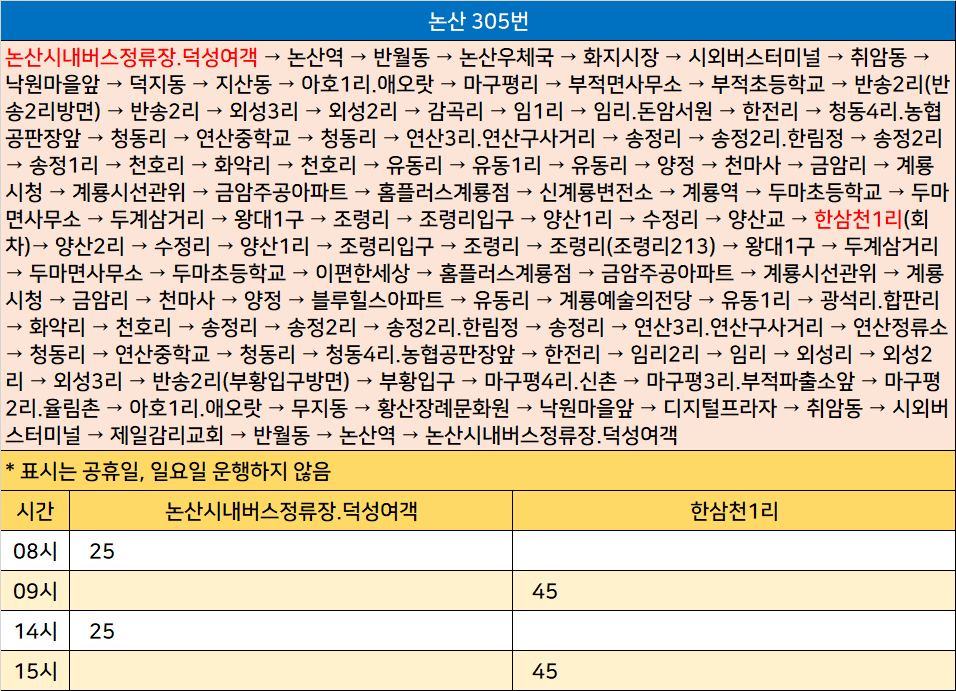 논산 305-1번: 벌곡 → 양산2리 → 수정리 → 양산1리 → 조령리입구 → 조령리 → 조령리(조령리213) → 왕대1구 → 두계삼거리 → 두마면사무소 → 두마초등학교 → 이편한세상 → 홈플러스계룡점 → 금암주공아파트 → 계룡시선관위 → 계룡시청 → 평화장로교회 → 신도농원 → 계룡대입구 → 신도안면사무소 → 신도안아파트 → 해군아파트 → 용남고.쇼핑타운 → 계룡복지센터 → 공용주차장 → 계룡대입구 → 무궁화동산 → 엄사지구입구 → 두산아파트 → 양정 → 블루힐스아파트 → 유동리 → 계룡예술의전당 → 유동1리 → 광석리.합판리 → 화악리 → 천호리 → 송정리 → 송정2리 → 송정2리.한림정 → 송정리 → 연산3리.연산구사거리 → 연산정류소 → 청동리 → 연산중학교 → 청동리 → 청동4리.농협공판장앞 → 한전리 → 임리2리 → 임리 → 외성리 → 외성2리 → 외성3리 → 반송2리(부황입구방면) → 부황입구 → 마구평4리.신촌 → 마구평3리.부적파출소앞 → 마구평2리.율림촌 → 아호1리.애오랏 → 무지동 → 황산장례문화원 → 낙원마을앞 → 디지털프라자 → 취암동 → 시외버스터미널 → 제일감리교회 → 반월동 → 논산역