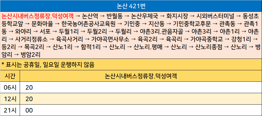 논산 421번: 논산시내버스정류장.덕성여객 → 논산역 → 반월동 → 논산우체국 → 화지시장 → 시외버스터미널 → 동성초등학교앞 → 문화마을 → 한국농어촌공사교육원 → 기민중 → 지산동 → 기민중학교후문 → 관촉동 → 관촉1동 → 와야리 → 서포 → 두월1리 → 두월2리 → 두월리 → 야촌3리.관음자골 → 야촌3리 → 야촌1리 → 야촌리 → 사거리정류소 → 육곡사거리 → 가야곡면사무소 → 육곡2리 → 육곡리 → 가야곡중학교 → 강청1리 → 등2리 → 목곡2리 → 산노1리 → 함적1리 → 산노리 → 산노리.평매 → 산노리 → 산노리종점 → 산노리 → 병암리 → 병암2리