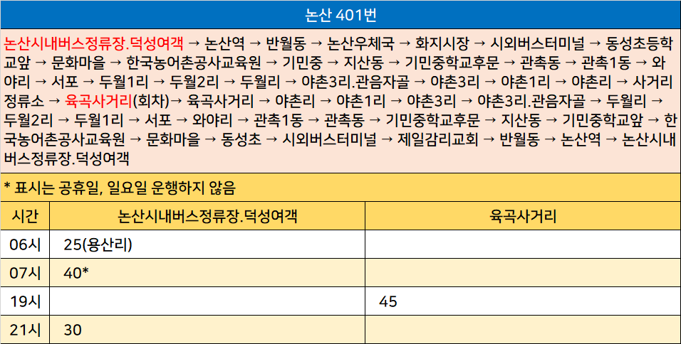 논산 401번: 논산시내버스정류장.덕성여객 → 논산역 → 반월동 → 논산우체국 → 화지시장 → 시외버스터미널 → 동성초등학교앞 → 문화마을 → 한국농어촌공사교육원 → 기민중 → 지산동 → 기민중학교후문 → 관촉동 → 관촉1동 → 와야리 → 서포 → 두월1리 → 두월2리 → 두월리 → 야촌3리.관음자골 → 야촌3리 → 야촌1리 → 야촌리 → 사거리정류소 → 육곡사거리(회차)→ 육곡사거리 → 야촌리 → 야촌1리 → 야촌3리 → 야촌3리.관음자골 → 두월리 → 두월2리 → 두월1리 → 서포 → 와야리 → 관촉1동 → 관촉동 → 기민중학교후문 → 지산동 → 기민중학교앞 → 한국농어촌공사교육원 → 문화마을 → 동성초 → 시외버스터미널 → 제일감리교회 → 반월동 → 논산역 → 논산시내버스정류장.덕성여객