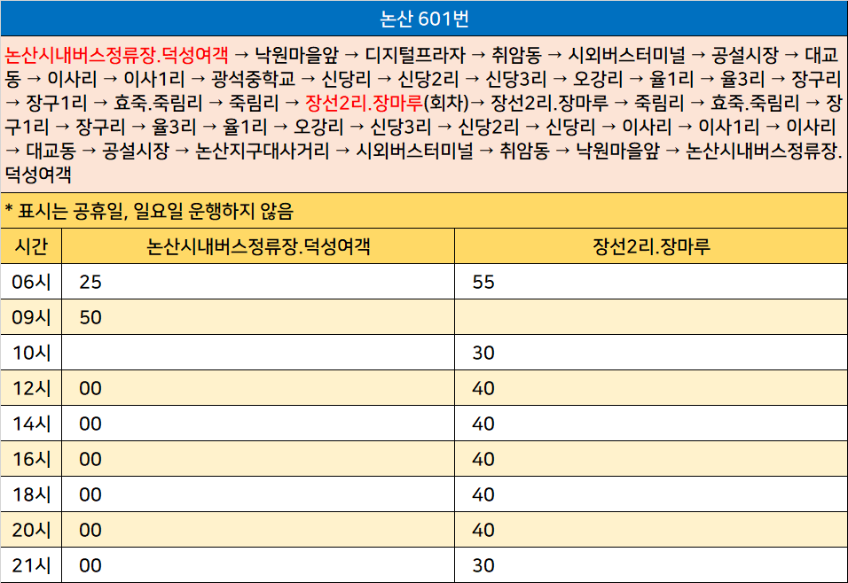논산 601번: 논산시내버스정류장.덕성여객 → 낙원마을앞 → 디지털프라자 → 취암동 → 시외버스터미널 → 공설시장 → 대교동 → 이사리 → 이사1리 → 광석중학교 → 신당리 → 신당2리 → 신당3리 → 오강리 → 율1리 → 율3리 → 장구리 → 장구1리 → 효죽.죽림리 → 죽림리 → 장선2리.장마루(회차)→ 장선2리.장마루 → 죽림리 → 효죽.죽림리 → 장구1리 → 장구리 → 율3리 → 율1리 → 오강리 → 신당3리 → 신당2리 → 신당리 → 이사리 → 이사1리 → 이사리 → 대교동 → 공설시장 → 논산지구대사거리 → 시외버스터미널 → 취암동 → 낙원마을앞 → 논산시내버스정류장.덕성여객