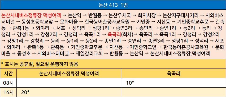 논산 413-1번: 논산시내버스정류장.덕성여객 → 논산역 → 반월동 → 논산우체국 → 화지시장 → 논산지구대사거리 → 시외버스터미널 → 동성초등학교앞 → 문화마을 → 한국농어촌공사교육원 → 기민중 → 지산동 → 기민중학교후문 → 관촉동 → 관촉1동 → 와야리 → 서포 → 성덕리 → 성평1리 → 종연3리 → 종연리 → 종연1리 → 등2리 → 등리 → 강청리 → 강청1리 → 강청2리 → 강청리 → 육곡1리 → 육곡리(회차)→ 육곡리 → 육곡1리 → 강청리 → 강청2리 → 강청1리 → 강청리 → 등리 → 등1리 → 등2리 → 종연1리 → 종연리 → 종연3리 → 성평1리 → 성덕리 → 서포 → 와야리 → 관촉1동 → 관촉동 → 기민중학교후문 → 지산동 → 기민중학교앞 → 한국농어촌공사교육원 → 문화마을 → 동성초 → 시외버스터미널 → 제일감리교회 → 반월동 → 논산역 → 논산시내버스정류장.덕성여객
