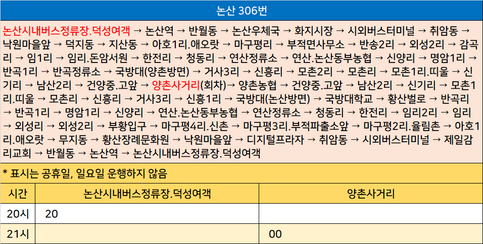논산 306번: 논산시내버스정류장.덕성여객 → 논산역 → 반월동 → 논산우체국 → 화지시장 → 시외버스터미널 → 취암동 → 낙원마을앞 → 덕지동 → 지산동 → 아호1리.애오랏 → 마구평리 → 부적면사무소 → 반송2리 → 외성2리 → 감곡리 → 임1리 → 임리.돈암서원 → 한전리 → 청동리 → 연산정류소 → 연산.논산동부농협 → 신양리 → 명암1리 → 반곡1리 → 반곡정류소 → 국방대(양촌방면) → 거사3리 → 신흥리 → 모촌2리 → 모촌리 → 모촌1리.띠울 → 신기리 → 남산2리 → 건양중.고앞 → 양촌사거리(회차)→ 양촌농협 → 건양중.고앞 → 남산2리 → 신기리 → 모촌1리.띠울 → 모촌리 → 신흥리 → 거사3리 → 신흥1리 → 국방대(논산방면) → 국방대학교 → 황산벌로 → 반곡리 → 반곡1리 → 명암1리 → 신양리 → 연산.논산동부농협 → 연산정류소 → 청동리 → 한전리 → 임리2리 → 임리 → 외성리 → 외성2리 → 부황입구 → 마구평4리.신촌 → 마구평3리.부적파출소앞 → 마구평2리.율림촌 → 아호1리.애오랏 → 무지동 → 황산장례문화원 → 낙원마을앞 → 디지털프라자 → 취암동 → 시외버스터미널 → 제일감리교회 → 반월동 → 논산역 → 논산시내버스정류장.덕성여객