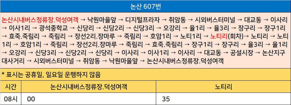 논산 607번: 논산시내버스정류장.덕성여객 → 낙원마을앞 → 디지털프라자 → 취암동 → 시외버스터미널 → 대교동 → 이사리 → 이사1리 → 광석중학교 → 신당리 → 신당2리 → 신당3리 → 오강리 → 율1리 → 율3리 → 장구리 → 장구1리 → 효죽.죽림리 → 죽림리 → 장선2리.장마루 → 죽림리 → 호암1리 → 노티1리 → 노티리(회차)→ 노티리 → 노티1리 → 호암1리 → 죽림리 → 장선2리.장마루 → 죽림리 → 효죽.죽림리 → 장구1리 → 장구리 → 율3리 → 율1리 → 오강리 → 신당3리 → 신당2리 → 신당리 → 이사리 → 이사1리 → 이사리 → 대교동 → 공설시장 → 논산지구대사거리 → 시외버스터미널 → 취암동 → 낙원마을앞 → 논산시내버스정류장.덕성여객