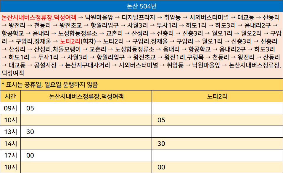 논산 504번: 논산시내버스정류장.덕성여객 → 낙원마을앞 → 디지털프라자 → 취암동 → 시외버스터미널 → 대교동 → 산동리 → 왕전리 → 천동리 → 왕전초교 → 항월리입구 → 사월3리 → 두사1리 → 하도1리 → 하도3리 → 읍내리2구 → 항공학교 → 읍내리 → 노성합동정류소 → 교촌리 → 산성리 → 신충리 → 신충3리 → 월오1리 → 월오2리 → 구암리 → 구암리.장재울 → 노티2리(회차)→ 노티2리 → 구암리.장재울 → 구암리 → 월오1리 → 신충3리 → 신충리 → 산성리 → 산성리.차돌모랭이 → 교촌리 → 노성합동정류소 → 읍내리 → 항공학교 → 읍내리2구 → 하도3리 → 하도1리 → 두사1리 → 사월3리 → 항월리입구 → 왕전초교 → 왕전1리.구렁목 → 천동리 → 왕전리 → 산동리 → 대교동 → 공설시장 → 논산지구대사거리 → 시외버스터미널 → 취암동 → 낙원마을앞 → 논산시내버스정류장.덕성여객
