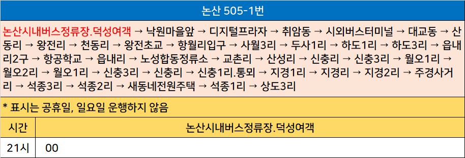 논산 505-1번: 논산시내버스정류장.덕성여객 → 낙원마을앞 → 디지털프라자 → 취암동 → 시외버스터미널 → 대교동 → 산동리 → 왕전리 → 천동리 → 왕전초교 → 항월리입구 → 사월3리 → 두사1리 → 하도1리 → 하도3리 → 읍내리2구 → 항공학교 → 읍내리 → 노성합동정류소 → 교촌리 → 산성리 → 신충리 → 신충3리 → 월오1리 → 월오2리 → 월오1리 → 신충3리 → 신충리 → 신충1리.통뫼 → 지경1리 → 지경리 → 지경2리 → 주경사거리 → 석종3리 → 석종2리 → 새동네전원주택 → 석종1리 → 상도3리