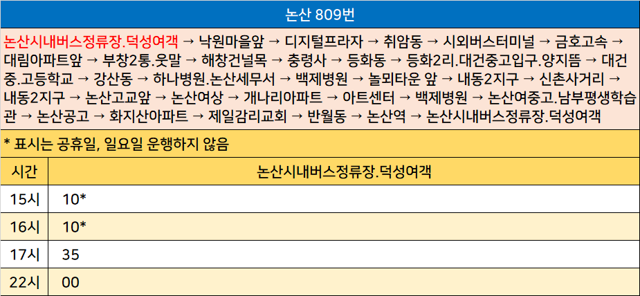 논산 809번: 논산시내버스정류장.덕성여객 → 낙원마을앞 → 디지털프라자 → 취암동 → 시외버스터미널 → 금호고속 → 대림아파트앞 → 부창2통.웃말 → 해창건널목 → 충령사 → 등화동 → 등화2리.대건중고입구.양지뜸 → 대건중.고등학교 → 강산동 → 하나병원.논산세무서 → 백제병원 → 놀뫼타운 앞 → 내동2지구 → 신촌사거리 → 내동2지구 → 논산고교앞 → 논산여상 → 개나리아파트 → 아트센터 → 백제병원 → 논산여중고.남부평생학습관 → 논산공고 → 화지산아파트 → 제일감리교회 → 반월동 → 논산역 → 논산시내버스정류장.덕성여객