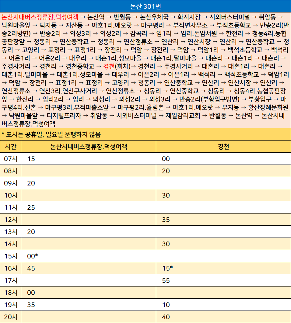 논산 301번: 논산시내버스정류장.덕성여객 → 논산역 → 반월동 → 논산우체국 → 화지시장 → 시외버스터미널 → 취암동 → 낙원마을앞 → 덕지동 → 지산동 → 아호1리.애오랏 → 마구평리 → 부적면사무소 → 부적초등학교 → 반송2리(반송2리방면) → 반송2리 → 외성3리 → 외성2리 → 감곡리 → 임1리 → 임리.돈암서원 → 한전리 → 청동4리.농협공판장앞 → 청동리 → 연산중학교 → 청동리 → 연산정류소 → 연산리 → 연산시장 → 연산리 → 연산중학교 → 청동리 → 고양리 → 표정리 → 표정1리 → 장전리 → 덕암 → 장전리 → 덕암 → 덕암1리 → 백석초등학교 → 백석리 → 어은1리 → 어은2리 → 대우리 → 대촌1리.성모마을 → 대촌1리.달미마을 → 대촌리 → 대촌1리 → 대촌리 → 주경사거리 → 경천리 → 경천중학교 → 경천(회차)→ 경천리 → 주경사거리 → 대촌리 → 대촌1리 → 대촌리 → 대촌1리.달미마을 → 대촌1리.성모마을 → 대우리 → 어은2리 → 어은1리 → 백석리 → 백석초등학교 → 덕암1리 → 덕암 → 장전리 → 표정1리 → 표정리 → 고양리 → 청동리 → 연산중학교 → 연산리 → 연산시장 → 연산리 → 연산정류소 → 연산3리.연산구사거리 → 연산정류소 → 청동리 → 연산중학교 → 청동리 → 청동4리.농협공판장앞 → 한전리 → 임리2리 → 임리 → 외성리 → 외성2리 → 외성3리 → 반송2리(부황입구방면) → 부황입구 → 마구평4리.신촌 → 마구평3리.부적파출소앞 → 마구평2리.율림촌 → 아호1리.애오랏 → 무지동 → 황산장례문화원 → 낙원마을앞 → 디지털프라자 → 취암동 → 시외버스터미널 → 제일감리교회 → 반월동 → 논산역 → 논산시내버스정류장.덕성여객