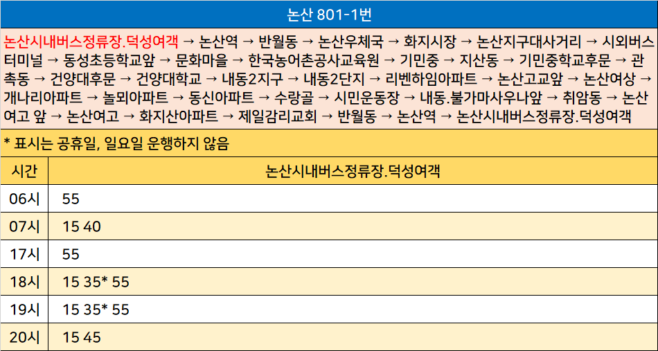 논산 801-1번: 논산시내버스정류장.덕성여객 → 논산역 → 반월동 → 논산우체국 → 화지시장 → 논산지구대사거리 → 시외버스터미널 → 동성초등학교앞 → 문화마을 → 한국농어촌공사교육원 → 기민중 → 지산동 → 기민중학교후문 → 관촉동 → 건양대후문 → 건양대학교 → 내동2지구 → 내동2단지 → 리벤하임아파트 → 논산고교앞 → 논산여상 → 개나리아파트 → 놀뫼아파트 → 동신아파트 → 수랑골 → 시민운동장 → 내동.불가마사우나앞 → 취암동 → 논산여고 앞 → 논산여고 → 화지산아파트 → 제일감리교회 → 반월동 → 논산역 → 논산시내버스정류장.덕성여객