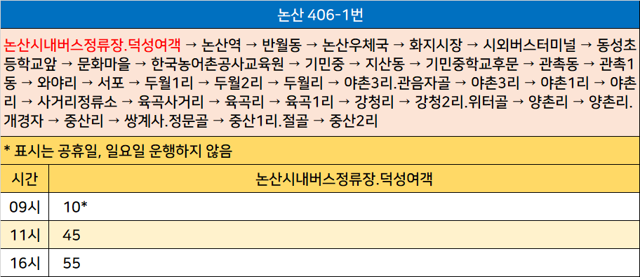 논산 406-1번: 논산시내버스정류장.덕성여객 → 논산역 → 반월동 → 논산우체국 → 화지시장 → 시외버스터미널 → 동성초등학교앞 → 문화마을 → 한국농어촌공사교육원 → 기민중 → 지산동 → 기민중학교후문 → 관촉동 → 관촉1동 → 와야리 → 서포 → 두월1리 → 두월2리 → 두월리 → 야촌3리.관음자골 → 야촌3리 → 야촌1리 → 야촌리 → 사거리정류소 → 육곡사거리 → 육곡리 → 육곡1리 → 강청리 → 강청2리.위터골 → 양촌리 → 양촌리.개경자 → 중산리 → 쌍계사.정문골 → 중산1리.절골 → 중산2리