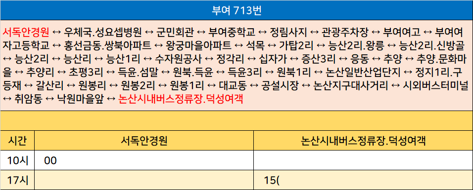 부여 713번: 서독안경원 ↔ 우체국.성요셉병원 ↔ 군민회관 ↔ 부여중학교 ↔ 정림사지 ↔ 관광주차장 ↔ 부여여고 ↔ 부여여자고등학교 ↔ 홍선금동.쌍북아파트 ↔ 왕궁마을아파트 ↔ 석목 ↔ 가탑2리 ↔ 능산2리.왕릉 ↔ 능산2리.신방골 ↔ 능산2리 ↔ 능산리 ↔ 능산1리 ↔ 수자원공사 ↔ 정각리 ↔ 십자가 ↔ 증산3리 ↔ 응동 ↔ 추양 ↔ 추양.문화마을 ↔ 추양리 ↔ 초평3리 ↔ 득윤.섬말 ↔ 원북.득윤 ↔ 득윤3리 ↔ 원북1리 ↔ 논산일반산업단지 ↔ 정지1리.구등재 ↔ 갈산리 ↔ 원봉리 ↔ 원봉2리 ↔ 원봉1리 ↔ 대교동 ↔ 공설시장 ↔ 논산지구대사거리 ↔ 시외버스터미널 ↔ 취암동 ↔ 낙원마을앞 ↔ 논산시내버스정류장.덕성여객