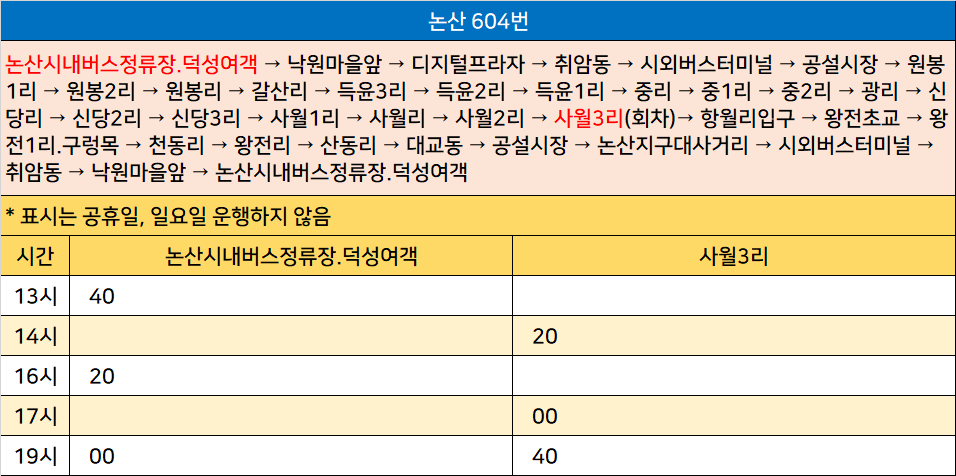 논산 604번: 논산시내버스정류장.덕성여객 → 낙원마을앞 → 디지털프라자 → 취암동 → 시외버스터미널 → 공설시장 → 원봉1리 → 원봉2리 → 원봉리 → 갈산리 → 득윤3리 → 득윤2리 → 득윤1리 → 중리 → 중1리 → 중2리 → 광리 → 신당리 → 신당2리 → 신당3리 → 사월1리 → 사월리 → 사월2리 → 사월3리(회차)→ 항월리입구 → 왕전초교 → 왕전1리.구렁목 → 천동리 → 왕전리 → 산동리 → 대교동 → 공설시장 → 논산지구대사거리 → 시외버스터미널 → 취암동 → 낙원마을앞 → 논산시내버스정류장.덕성여객