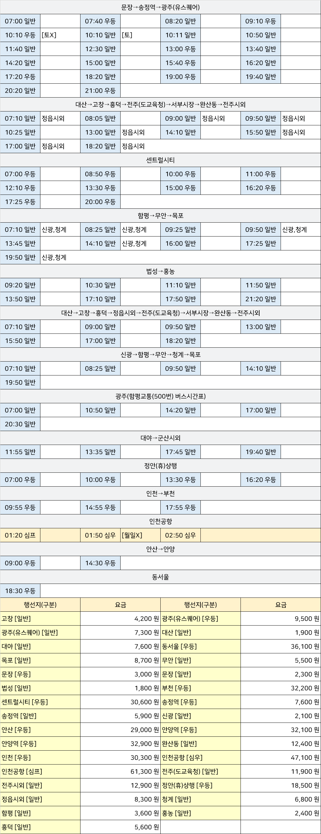 영광 시외버스 터미널 시간표/요금표 2025년 05월 18일 기준