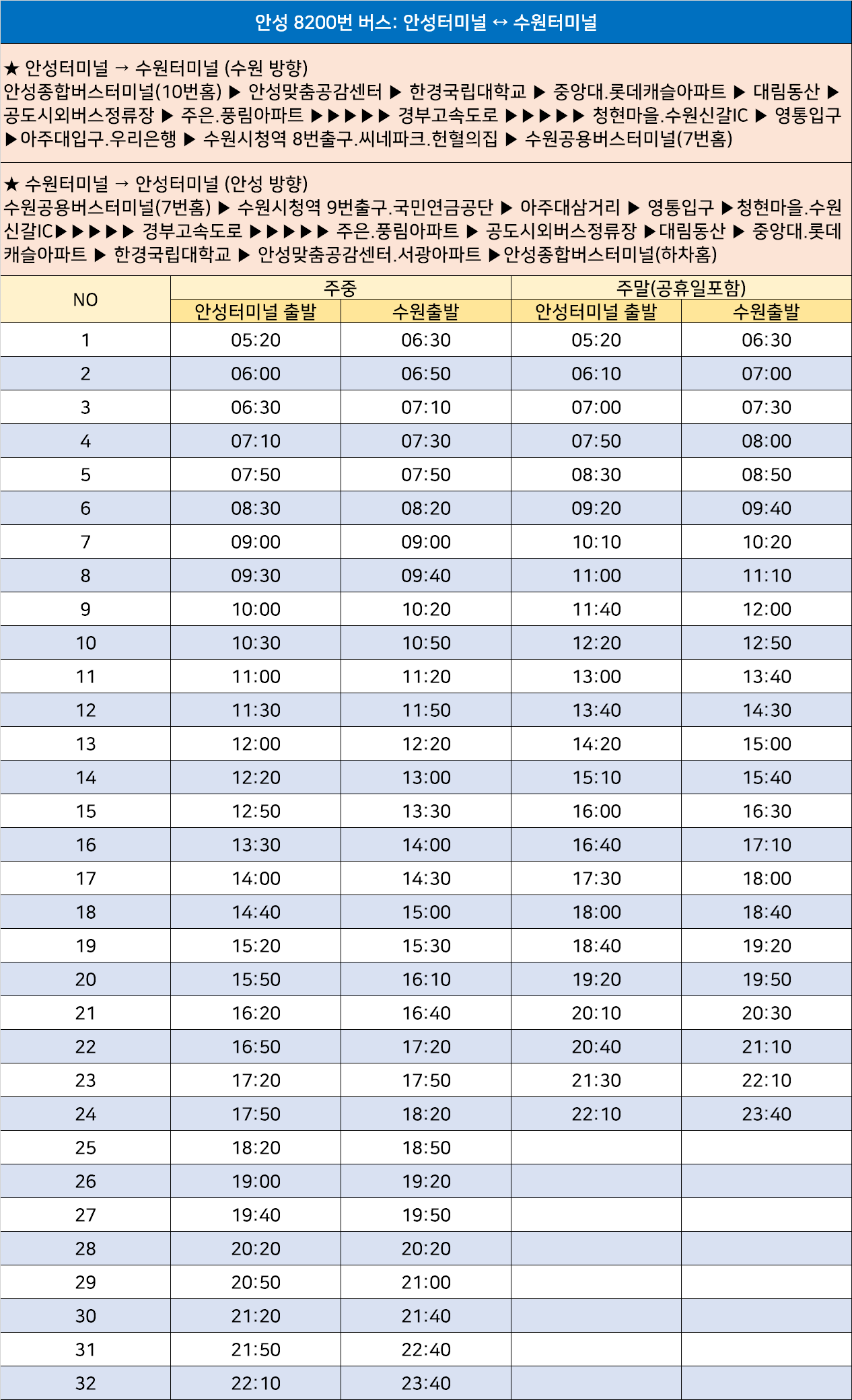 안성 8200번: 안성종합버스터미널(10번홈) → 안성맞춤공감센터 → 한경국립대학교 → 중앙대.롯데캐슬아파트 → 대림동산 → 공도시외버스정류장 → 주은.풍림아파트 → 경부고속도로 → 청현마을.수원신갈IC → 영통입구 → 아주대입구.우리은행 → 수원시청역 8번출구.씨네파크.헌혈의집 → 수원공용버스터미널(7번홈) / 수원공용버스터미널(7번홈) → 수원시청역 9번출구.국민연금공단 → 아주대삼거리 → 영통입구 → 청현마을.수원신갈IC → 경부고속도로 → 주은.풍림아파트 → 공도시외버스정류장 → 대림동산 → 중앙대.롯데캐슬아파트 → 한경국립대학교 → 안성맞춤공감센터.서광아파트 → 안성종합버스터미널(하차홈)