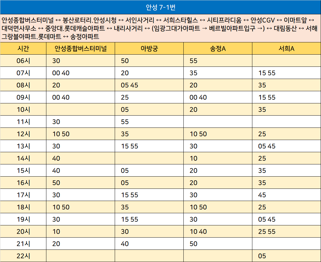 안성 7-1번: 안성종합버스터미널 ↔ 봉산로터리.안성시청 ↔ 서인사거리 ↔ 서희스타힐스 ↔ 시티프라디움 ↔ 안성CGV ↔ 이마트앞 ↔ 대덕면사무소 ↔ 중앙대.롯데캐슬아파트 ↔ 내리사거리 ↔ (임광그대가아파트 → 베르빌아파트입구 →) ↔ 대림동산 ↔ 서해그랑블아파트.롯데마트 ↔ 송정아파트