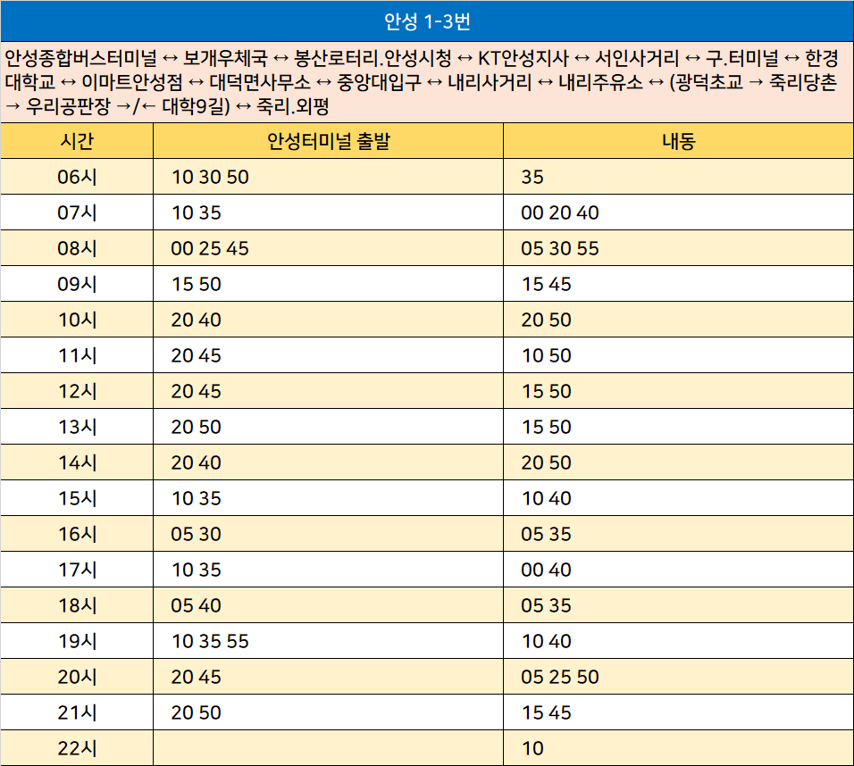 안성 1-3번: 안성종합버스터미널 ↔ 보개우체국 ↔ 봉산로터리.안성시청 ↔ KT안성지사 ↔ 서인사거리 ↔ 구.터미널 ↔ 한경대학교 ↔ 이마트안성점 ↔ 대덕면사무소 ↔ 중앙대입구 ↔ 내리사거리 ↔ 내리주유소 ↔ (광덕초교 → 죽리당촌 → 우리공판장 →/← 대학9길) ↔ 죽리.외평