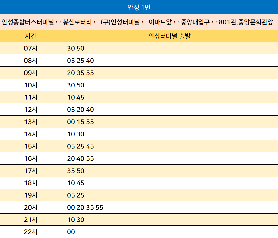안성 중앙대 시외버스 정류장 시간표/요금표 2025년 04월 10일 기준