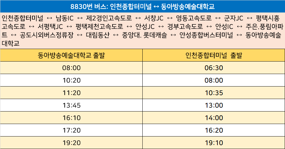 8830번: 인천종합터미널 ↔ 남동IC ↔ 제2경인고속도로 ↔ 서창JC ↔ 영동고속도로 ↔ 군자JC ↔ 평택시흥고속도로 ↔ 서평택JC ↔ 평택제천고속도로 ↔ 안성JC ↔ 경부고속도로 ↔ 안성IC ↔ 주은.풍림아파트 ↔ 공도시외버스정류장 ↔ 대림동산 ↔ 중앙대. 롯데캐슬 ↔ 안성종합버스터미널 ↔ 동아방송예술대학교