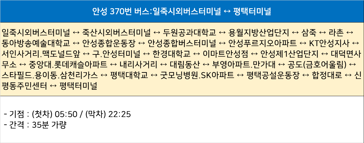 안성 370번: 일죽시외버스터미널 ↔ 죽산시외버스터미널 ↔ 두원공과대학교 ↔ 용월지방산업단지 ↔ 삼죽 ↔ 라촌 ↔ 동아방송예술대학교 ↔ 안성종합운동장 ↔ 안성종합버스터미널 ↔ 안성푸르지오아파트 ↔ KT안성지사 ↔ 서인사거리.맥도널드앞 ↔ 구.안성터미널 ↔ 한경대학교 ↔ 이마트안성점 ↔ 안성제1산업단지 ↔ 대덕면사무소 ↔ 중앙대.롯데캐슬아파트 ↔ 내리사거리 ↔ 대림동산 ↔ 부영아파트.만가대 ↔ 공도(금호어울림) ↔ 스타필드.용이동.삼천리가스 ↔ 평택대학교 ↔ 굿모닝병원.SK아파트 ↔ 평택공설운동장 ↔ 합정대로 ↔ 신평동주민센터 ↔ 평택터미널